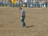 There are six teams. (Random everyday people that want to give this a whirl.) You sign up your team of 3 men for $20/person. Each team is assigned a cow. Wild cow? Meaning a cow that has never been milked by a person before, and therefore not about to start now. Each cow has on a haulter with a rope tied to it. The 1st whistle is to sound the shoots being opened. When the 2nd whistle is sounded each team can try to tackle and milk their cow. Each team also has a long neck bottle. They must milk the cow and get enough milk in the bottle to pour out. The 1st team to do so & run back to the judges wins.
